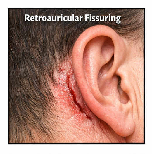 Retroauricular fissuring is a dermatologic condition characterized by painful linear cracks in the skin behind the ear and is commonly associated with inflammatory skin disorders such as seborrheic dermatitis. Although often considered minor, it can cause significant discomfort and may predispose patients to secondary infection if untreated.