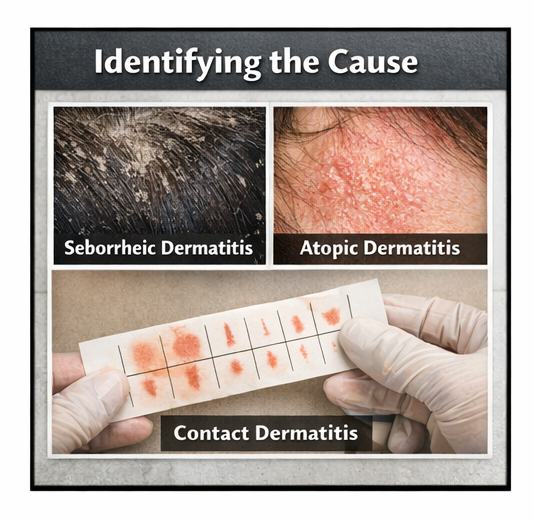 Seborrheic dermatitis is one of the most frequent underlying causes. It is a chronic inflammatory disorder associated with sebaceous gland activity and colonization by Malassezia species. Inflammation and scaling may extend beyond the scalp to involve the eyebrows, nasolabial folds, and retroauricular region.