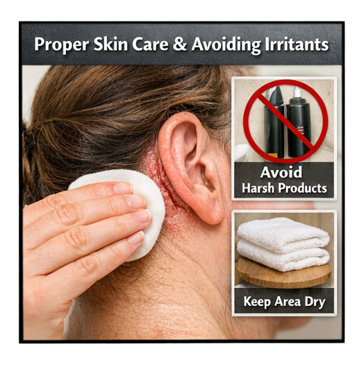 Early recognition and appropriate treatment can lead to rapid symptom relief, complete healing of retroauricular fissures, and effective prevention of recurrence. Prompt identification of the underlying dermatologic condition such as seborrheic dermatitis, atopic dermatitis, or contact dermatitis allows clinicians to initiate targeted therapy, including topical anti-inflammatory agents, antifungal treatments when indicated, and regular use of emollients to restore the skin barrier. In addition, patient education regarding proper skin care, avoidance of irritants, and maintenance therapy plays a crucial role in preventing repeated episodes. With timely diagnosis, appropriate medical management, and consistent follow-up, most patients experience significant clinical improvement, restoration of normal skin integrity, and a reduced risk of complications such as secondary infection or chronic skin irritation.