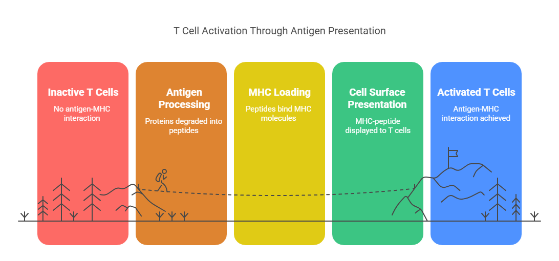 The ultimate goal of presenting neoantigens via MHC molecules is to activate specific T cells that can recognize and eliminate cancer cells. T cells express highly diverse T-cell receptors (TCRs) that recognize specific peptide-MHC complexes.