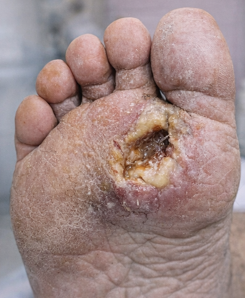 A 56-year-old man presented to the surgical outpatient department with a non-healing ulcer over the plantar aspect of his right foot for six weeks. He reported progressive swelling, foul-smelling discharge, and increasing pain over the past ten days.