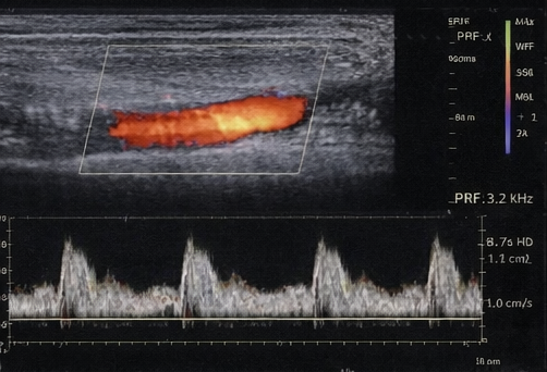 Duplex Doppler ultrasound of the lower limbs demonstrated mild peripheral arterial disease with preserved distal flow. There was no critical limb ischemia.