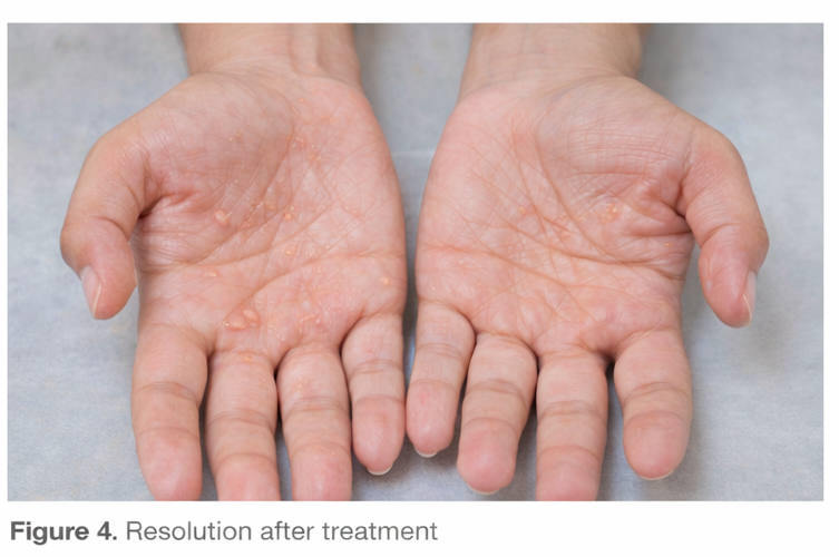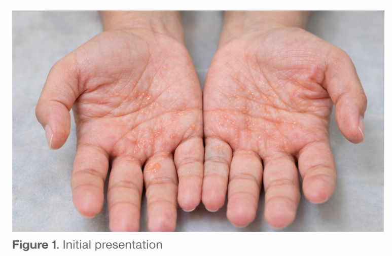 A 38-year-old woman presented to the dermatology outpatient clinic with a 6-month history of recurrent itchy eruptions on both palms. The lesions appeared episodically, often worsening during periods of emotional stress and hot weather. Each episode lasted approximately 2–3 weeks and partially resolved with over-the-counter topical creams, only to recur.