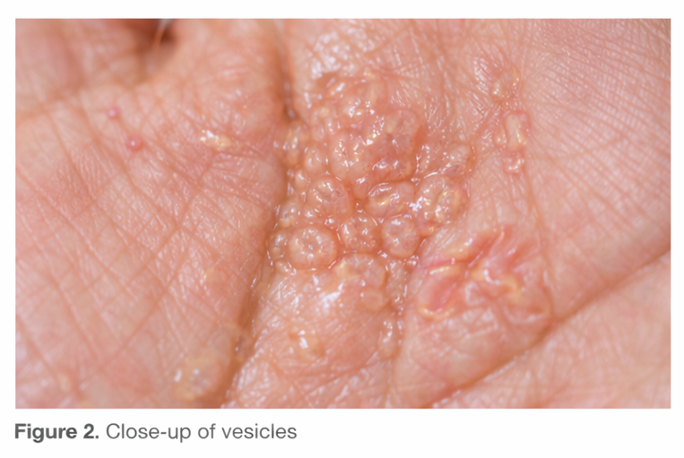 On examination, multiple symmetrical, deep-seated vesicles were observed over the central palms and lateral aspects of the fingers of both hands. The vesicles were small, tense, and translucent, with minimal surrounding erythema. Some areas showed mild scaling and post-inflammatory hyperpigmentation, suggesting resolving lesions.
