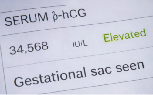 Subsequent quantitative assessment of serum beta–human chorionic gonadotropin (β-hCG) levels revealed values elevated in a pattern consistent with early gestation, supporting the clinical suspicion.