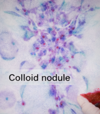 Fine-needle aspiration cytology (FNAC) of the dominant nodule was performed under ultrasound guidance and reported as benign colloid nodule, corresponding to Bethesda category II.