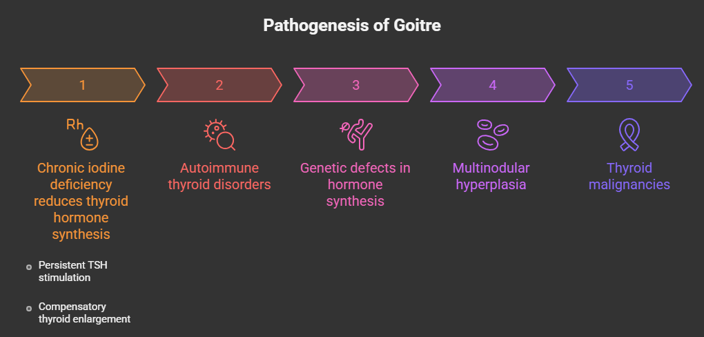 The pathogenesis of goitre is multifactorial. Chronic iodine deficiency leads to reduced thyroid hormone synthesis, resulting in sustained thyroid-stimulating hormone (TSH) stimulation and compensatory glandular hypertrophy and hyperplasia. Other causes include autoimmune thyroid diseases such as Graves’ disease and Hashimoto’s thyroiditis, genetic defects in thyroid hormone synthesis, multinodular hyperplasia, and thyroid malignancies [2].