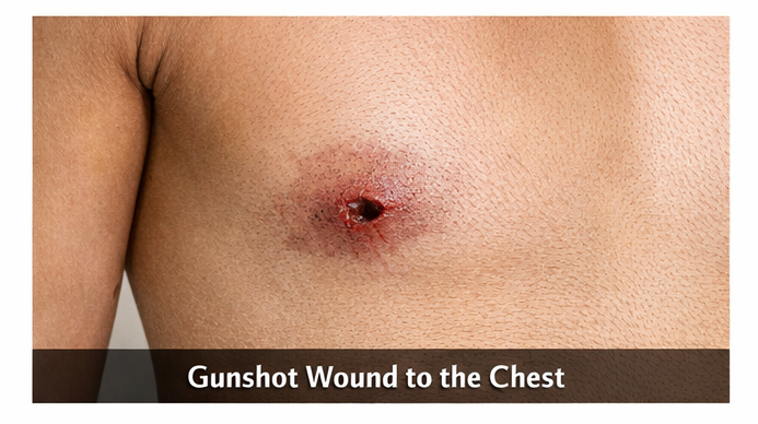 Penetrating chest trauma due to firearm injury poses significant diagnostic and therapeutic challenges. The clinical severity depends on the structures involved and the energy transferred by the projectile. Lung injury is the most common consequence, often resulting in pneumothorax, hemothorax, or pulmonary contusion. eFAST and chest radiography are essential initial diagnostic tools, while contrast-enhanced CT provides detailed assessment of intrathoracic injury and projectile trajectory.