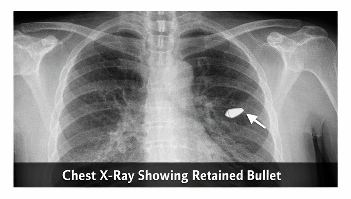 Firearm-related chest injuries represent a significant subset of penetrating thoracic trauma and are associated with high rates of organ injury, hemorrhage, and mortality. The thorax houses vital structures including the lungs, heart, great vessels, esophagus, and tracheobronchial tree, making penetrating trauma in this region particularly dangerous. The severity of injury depends on projectile velocity, trajectory, distance from the source, and secondary fragmentation. Clinical presentation ranges from minimal symptoms to hemorrhagic shock and respiratory failure. Prompt recognition, adherence to Advanced Trauma Life Support (ATLS) principles, rapid imaging, and early surgical consultation are essential to optimize outcomes. This case report describes the presentation, diagnostic workup, management strategy, and outcome of a patient with a retained bullet in the chest following firearm injury.