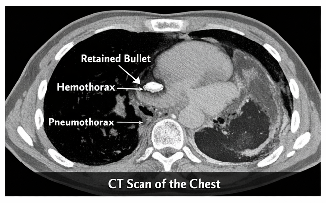 Contrast-enhanced computed tomography (CT) of the chest confirmed a retained bullet lodged in the posterior segment of the left lower lobe, associated with pulmonary laceration, moderate hemothorax, and pneumothorax. No major vascular or cardiac injury was identified. Baseline laboratory investigations showed mild anemia and elevated inflammatory markers.