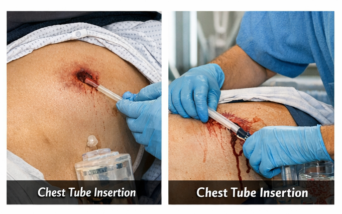 The patient was managed according to ATLS principles. Initial stabilization included oxygen supplementation, intravenous fluid resuscitation, and analgesia. A left-sided intercostal chest tube was inserted, draining approximately 600 mL of blood and air, with subsequent improvement in respiratory distress and oxygen saturation.