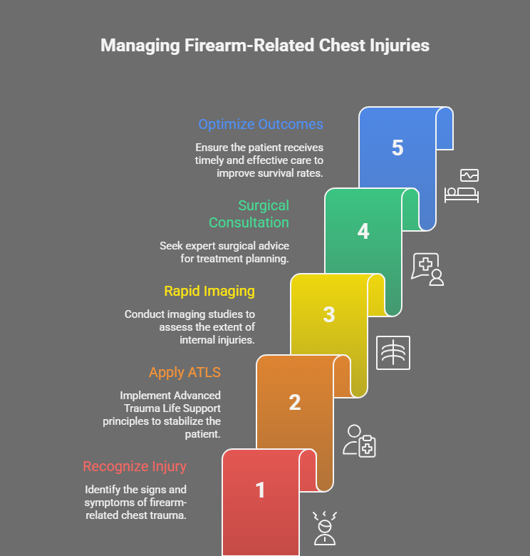 Management follows ATLS protocols, prioritizing airway, breathing, and circulation. Chest tube thoracostomy remains the cornerstone of treatment for pneumothorax and hemothorax. Surgical intervention is indicated in cases of massive hemothorax, ongoing bleeding, cardiac injury, major vascular injury, or retained foreign bodies causing infection or functional compromise. Retained bullets may be left in situ if asymptomatic and not associated with contamination, vascular injury, or risk of migration. Long-term follow-up is important to monitor for delayed complications such as infection, fibrosis, bronchopleural fistula, or hemoptysis.