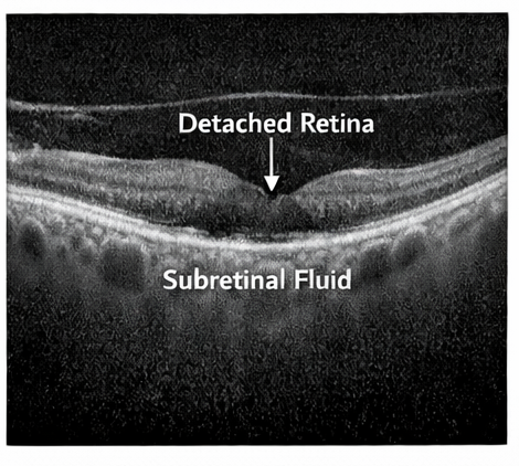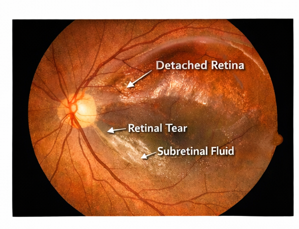 Retinal detachment is a serious ocular condition in which the neurosensory retina separates from the retinal pigment epithelium, disrupting photoreceptor function and potentially leading to irreversible vision loss. The most common form, rhegmatogenous retinal detachment, occurs when a retinal break allows vitreous fluid to accumulate beneath the retina. Other forms include tractional retinal detachment, usually associated with proliferative diabetic retinopathy, and exudative retinal detachment caused by inflammatory or vascular disorders.