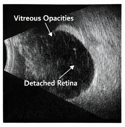 B-scan ultrasonography confirmed the presence of retinal detachment with a mobile detached retina and associated vitreous changes.