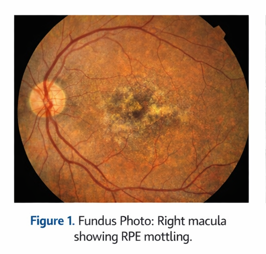 Dilated fundus examination of the right eye revealed subtle loss of foveal reflex with mild retinal pigment epithelial (RPE) mottling in the macular region.