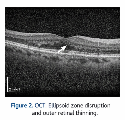 Spectral-domain OCT of the right eye demonstrated focal disruption of the ellipsoid zone with mild thinning of the outer retinal layers at the fovea. There was no evidence of intraretinal or subretinal fluid. The retinal pigment epithelium appeared irregular but intact. OCT of the left eye was normal.