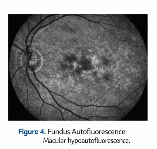 FAF imaging demonstrated focal areas of hypoautofluorescence at the macula, consistent with localized RPE dysfunction.