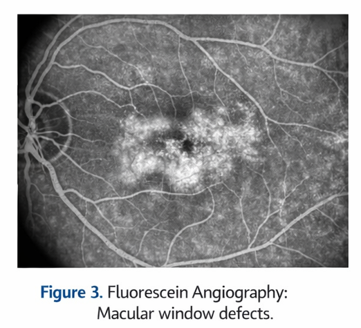 FFA showed mild window defects corresponding to areas of RPE alteration in the macula of the right eye without evidence of leakage, neovascularization, or pooling. These findings ruled out neovascular AMD and active central serous chorioretinopathy.