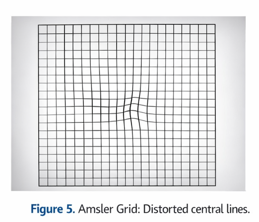 The patient was instructed on daily Amsler grid self-monitoring and advised to report any sudden worsening of vision or distortion.