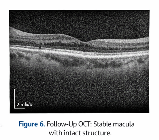 At three-month follow-up, the patient reported subjective stabilization of visual symptoms. BCVA remained 6/12 in the right eye. Repeat OCT showed no progression of outer retinal changes and no development of subretinal fluid.