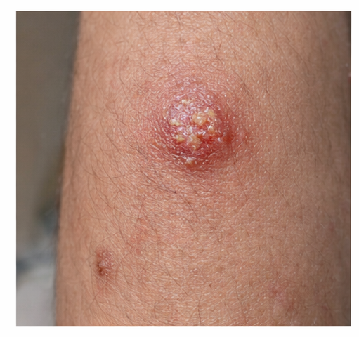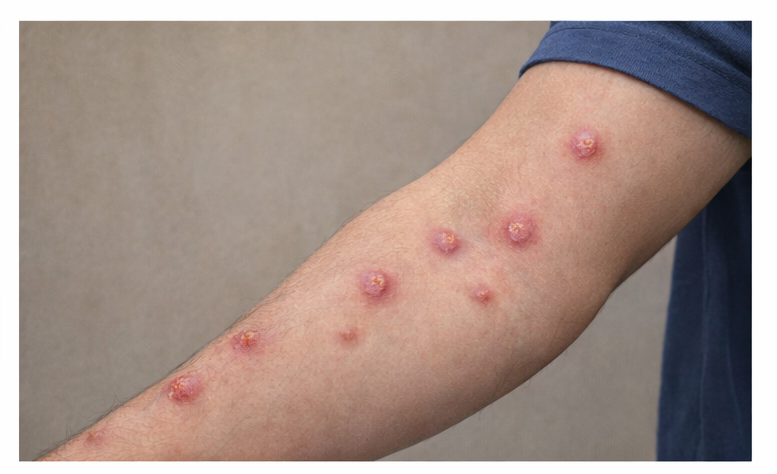 Some of the lesions demonstrated central crusting and shallow ulceration, suggesting localized breakdown of the overlying epidermis, while others remained dome-shaped with intact skin surfaces. There was no evidence of active purulent discharge, bleeding, or necrosis. On palpation, the nodules were non-tender, firm in consistency, and non-fluctuant, indicating the absence of abscess formation. The surrounding skin showed no significant erythema, warmth, or induration, effectively ruling out acute bacterial cellulitis.