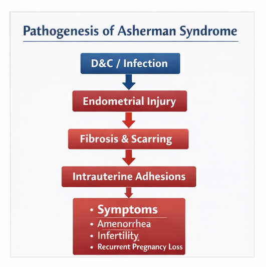 The pathogenesis involves destruction of the regenerative endometrial layer, leading to fibrosis and adhesion formation between opposing uterine walls. This disrupts normal endometrial regeneration and menstrual function.
