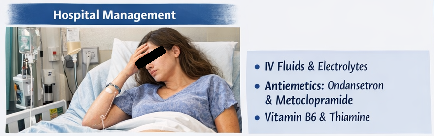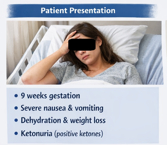A 26-year-old primigravida at 9 weeks of gestation presented to the obstetrics department with complaints of persistent nausea and severe vomiting for the past 3 weeks. The vomiting frequency had progressively increased, reaching up to 8–10 episodes per day, and was not relieved by dietary modifications.