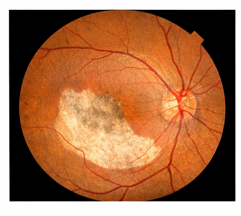 Color fundus photography was performed to document the size and extent of the lesion.