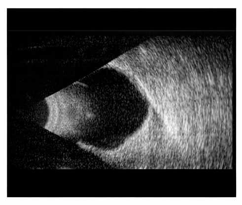 B-scan ultrasonography showed localized excavation of the posterior segment corresponding to the coloboma, without signs of retinal detachment or vitreous hemorrhage.