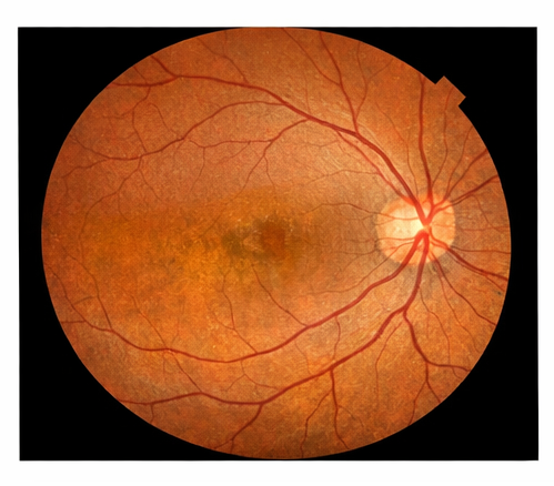 Dilated fundus examination of the right eye revealed a large, well-defined, pale excavated lesion involving the inferonasal quadrant of the posterior pole, extending from the optic disc margin toward the peripheral retina.