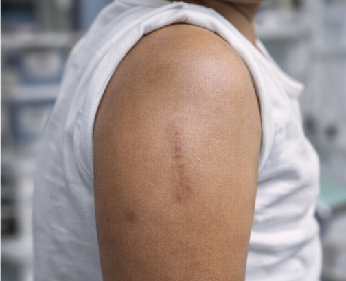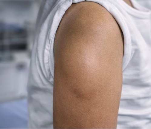 A 9-year-old female child was brought to the pediatric outpatient department with a complaint of a painless swelling over the posterior aspect of the left upper arm. The swelling was first noticed approximately six months prior and had gradually increased in size over time. There was no associated pain, redness, warmth, or history of trauma.