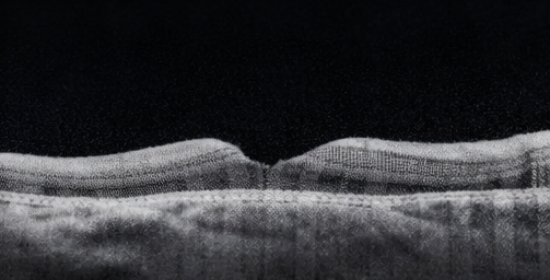 Spectral-domain OCT of the right eye confirmed macular detachment with accumulation of subretinal fluid beneath the fovea and loss of normal foveal contour.