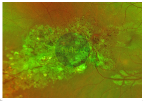 Management strategies depend on symptom severity, lesion location, and associated retinal complications. Asymptomatic or minimally symptomatic lesions can be safely managed with observation and periodic follow-up. However, visually significant cases may require intervention using modalities such as photodynamic therapy, laser photocoagulation, transpupillary thermotherapy, or low-dose radiotherapy [6]. Early identification and appropriate treatment are crucial, as timely intervention can lead to resolution of subretinal fluid, stabilization or improvement of vision, and a reduced risk of permanent visual loss.