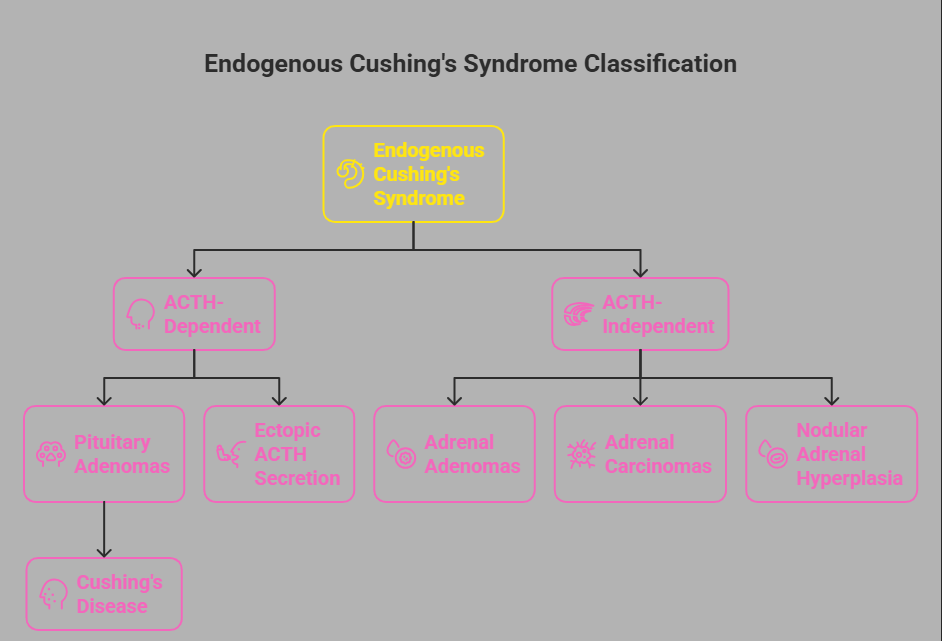 Endogenous Cushing’s syndrome is broadly classified into ACTH-dependent and ACTH-independent forms. ACTH-dependent causes include pituitary adenomas (Cushing’s disease) and ectopic ACTH secretion, whereas ACTH-independent causes primarily arise from adrenal adenomas, carcinomas, or nodular adrenal hyperplasia [2]. The clinical presentation is often subtle in early stages, leading to diagnostic delays that may span several years.