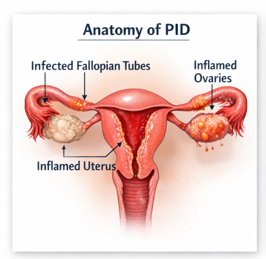 Pelvic Inflammatory Disease (PID) is an infection of the upper female genital tract, involving the uterus, fallopian tubes, ovaries, and surrounding pelvic structures. It is most commonly caused by ascending infections, particularly Chlamydia trachomatis and Neisseria gonorrhoeae, although polymicrobial etiologies are frequently implicated. PID remains a major cause of reproductive morbidity worldwide, contributing significantly to infertility, ectopic pregnancy, and chronic pelvic pain.