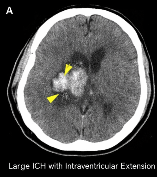 Large acute intracerebral hemorrhage remains one of the most lethal forms of stroke. Hematoma volume, intraventricular extension, initial GCS, and hematoma expansion are major predictors of mortality and functional outcome. Hypertension is the most common modifiable risk factor, particularly for deep hemorrhages involving the basal ganglia, thalamus, and brainstem.