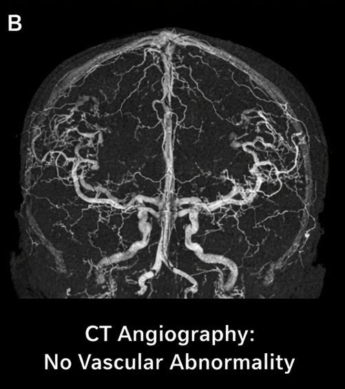 There was effacement of the ipsilateral lateral ventricle and early signs of raised intracranial pressure. CT angiography did not reveal any underlying vascular malformation or aneurysm.
