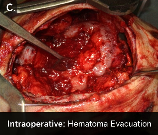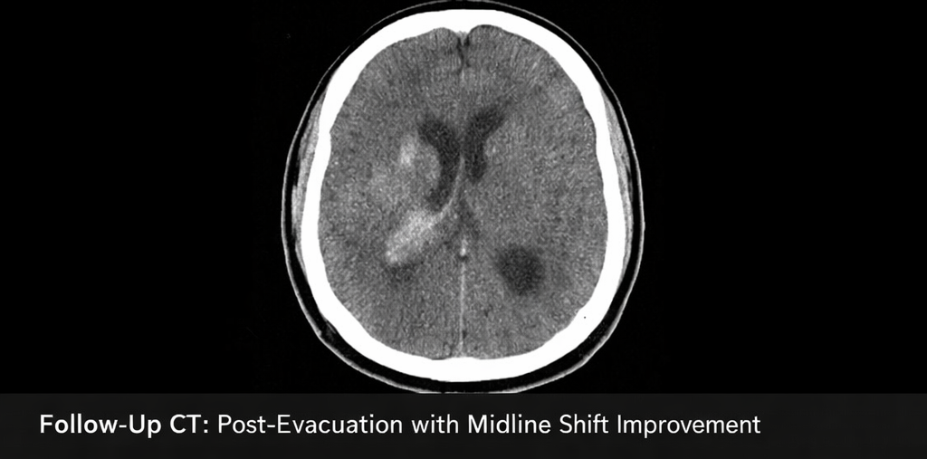 Neurosurgical consultation was obtained urgently. Given the large hematoma volume, mass effect, declining sensorium, and intraventricular extension with early hydrocephalus, the patient underwent decompressive craniectomy with hematoma evacuation.