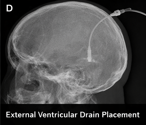 And placement of an external ventricular drain for cerebrospinal fluid diversion and intracranial pressure monitoring.