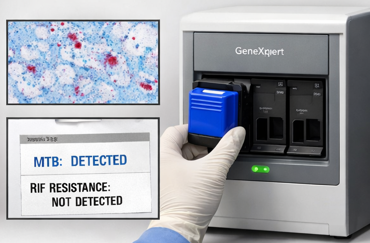 Rapid molecular diagnostics such as CBNAAT enable early detection of M. tuberculosis and simultaneous screening for rifampicin resistance, allowing prompt initiation of appropriate therapy. Radiological findings such as upper lobe cavitation and tree-in-bud nodularity are highly suggestive of active disease but are not diagnostic in isolation.