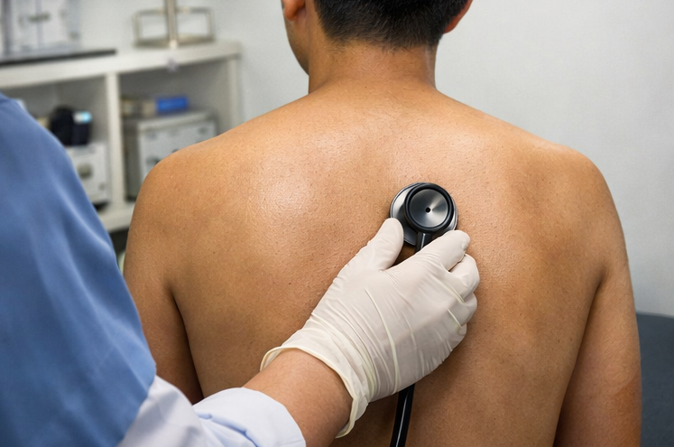 A 34-year-old man presented to the outpatient department with a 6-week history of persistent productive cough associated with yellowish sputum, low-grade intermittent fever, night sweats, and progressive unintentional weight loss of approximately 6 kg. Over the preceding 10 days, he reported intermittent episodes of blood-streaked sputum and one episode of mild hemoptysis. He also complained of generalized fatigue, anorexia, and reduced work capacity.