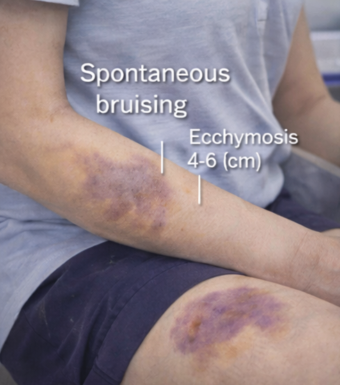 Ecchymosis is a frequent but often underappreciated clinical sign that may reflect underlying hemostatic abnormalities. Drug-induced platelet dysfunction is a common and reversible cause, particularly in patients receiving antiplatelet agents for cardiovascular disease [3].