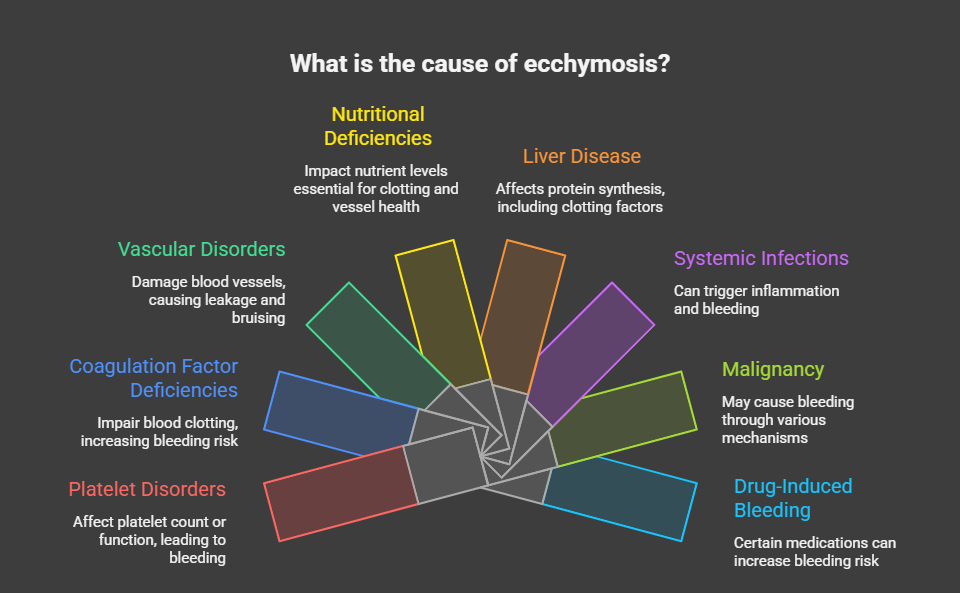 The differential diagnosis of ecchymosis is broad and includes platelet disorders, coagulation factor deficiencies, vascular disorders, nutritional deficiencies, liver disease, systemic infections, malignancy, and drug-induced bleeding tendencies [2]. Anticoagulants, antiplatelet agents, corticosteroids, and certain herbal supplements are frequently implicated.