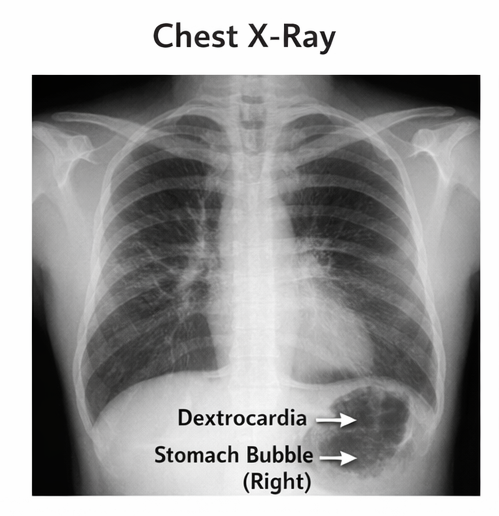 Chest X-ray revealed dextrocardia, with the cardiac apex directed toward the right side. The gastric air bubble was noted beneath the right hemidiaphragm, suggesting mirror-image abdominal organ positioning.