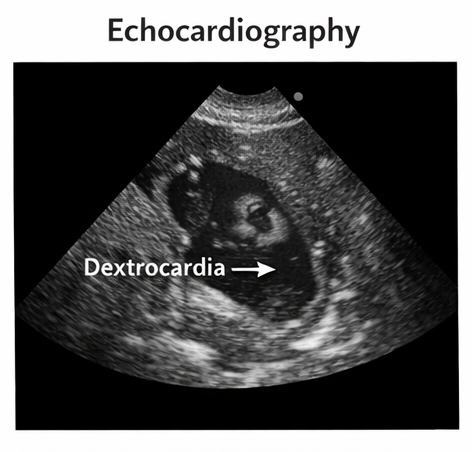 Echocardiographic evaluation confirmed dextrocardia with structurally normal cardiac chambers and valves, with no evidence of congenital heart disease.