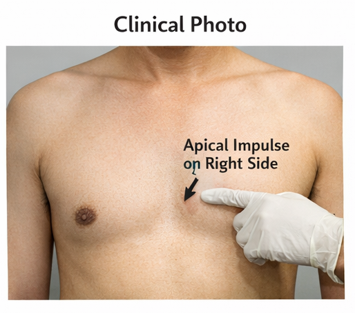 Cardiac examination revealed the apical impulse palpable in the right fifth intercostal space, raising suspicion of dextrocardia. Heart sounds were normal without murmurs.
