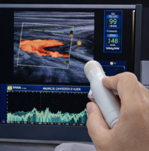 Doppler ultrasonography of the lower limbs demonstrated diffuse atherosclerotic changes with significantly reduced arterial flow in the left anterior tibial and posterior tibial arteries. Ankle–brachial index (ABI) on the left side was 0.45, consistent with severe peripheral arterial disease.