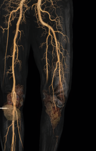 Computed tomography angiography (CTA) revealed multilevel arterial occlusion involving the superficial femoral artery with poor distal runoff, limiting the feasibility of revascularization.