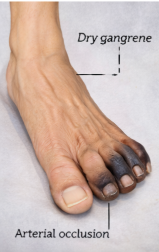 Dry gangrene represents the end stage of chronic ischemia and is a marker of advanced peripheral arterial disease. Diabetes mellitus plays a central role by accelerating atherosclerosis, impairing microcirculation, and reducing pain perception due to neuropathy, often leading to delayed presentation [3].