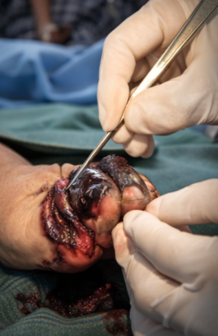 Intraoperatively, the proximal tissues appeared viable with minimal bleeding, confirming adequate demarcation. No purulent material or evidence of infection was noted.